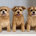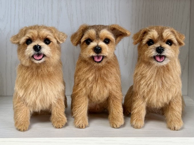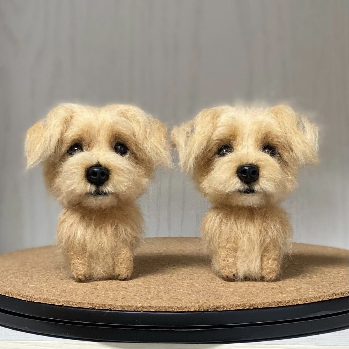 今回のオーダーさんは3頭さん。ふたりめのワンちゃんのお顔に着手中。同じ犬種で色の違いもほとんどないのでその子その子の特徴を表すのがとても難しいです🤔明日お鼻付けます☺️ #羊毛フェルト #ノーフォークテリア