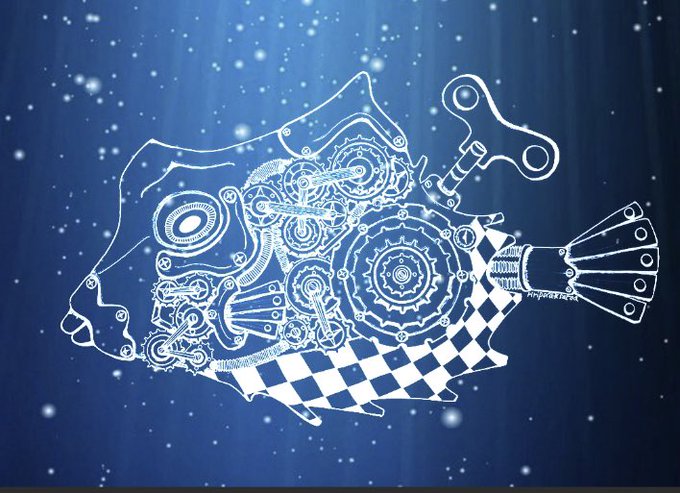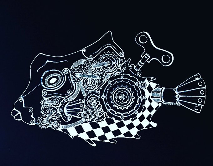 お疲れ様でした(о´∀`о) 全国各地が大荒れ天気です💦 皆様お気をつけて下さいT^T ⚙ハコフグ⚙ #スチームパンクイラスト #ハコフグ #歯車イラスト #ペン画 #絵描きさんと繋がりたい #アトリエの系譜S #アトリエの系譜plus