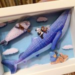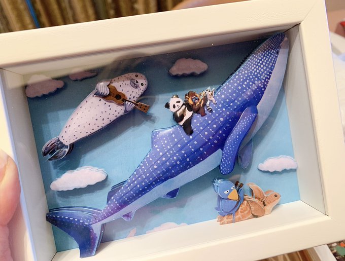 お友達が作ってくれたシャドーボックス。 ステキだ✨ なかなか飾れる場所がなくまだ箱の中で…ごめんなさい🙇♀️💦 #ue☆ #ハシビロコウ #ウクレレの旅シリーズ #ジンベイザメ #ゴマフアザラシ #ハシビロコウのシューちゃん #シャドーボックス #ただ今片付け中📦