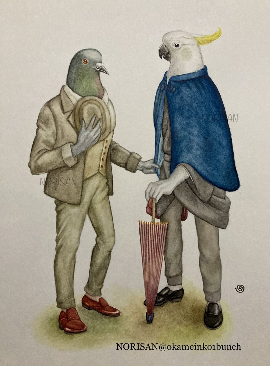 というわけで大好きなこの絵のファンアートを描きました。三代歌川広重 (円窓雑画) 遠見景色 (鸚鵡と鳩) #三代歌川広重 #ハト #オウム #NORISAN #illustration #太田記念美術館 twitter.com/ukiyoeota/stat…