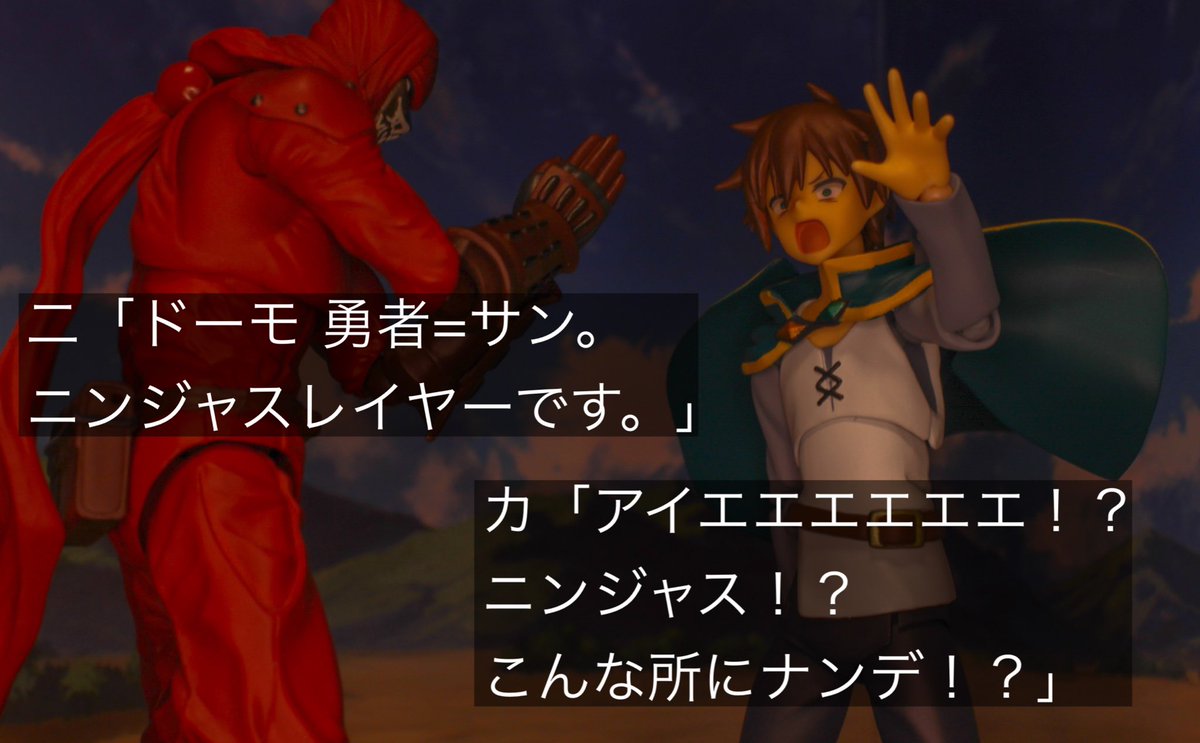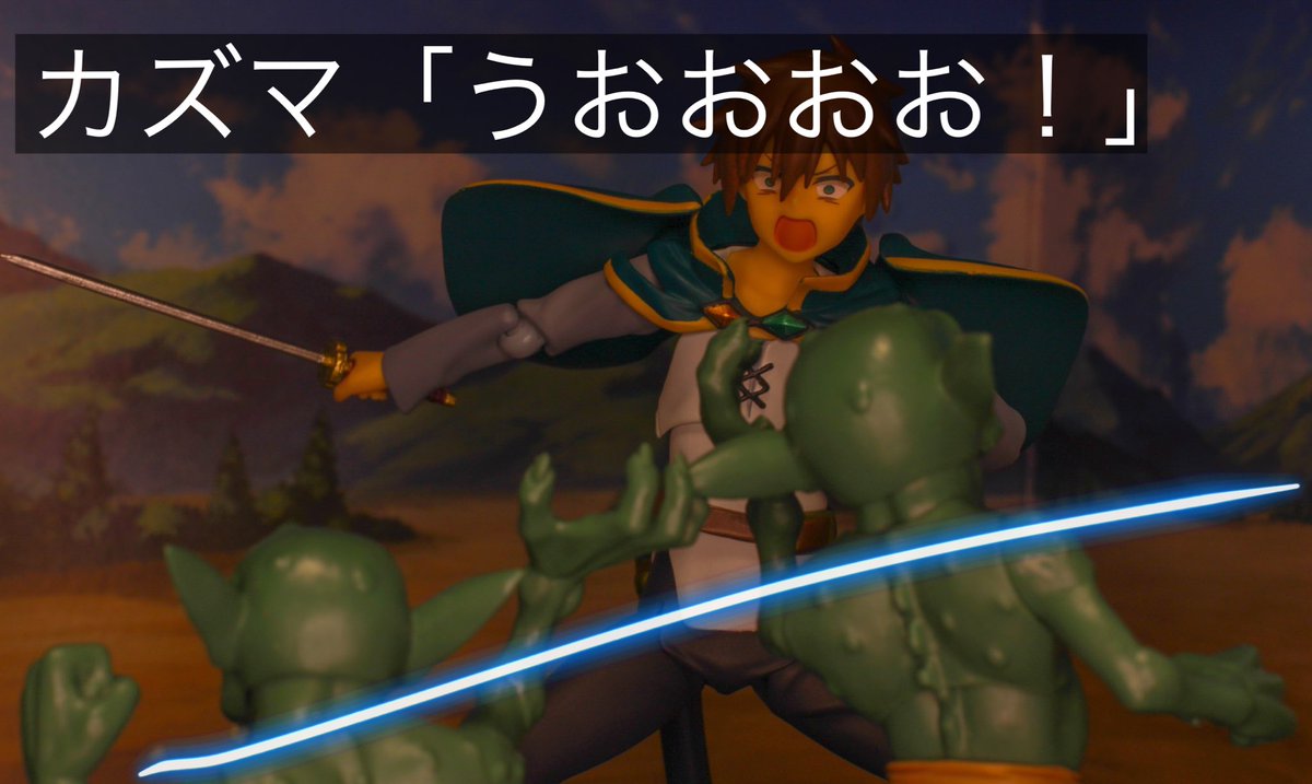 #夜のフィギュア撮影会 #オモ写 #ハリセンバース 2/8テーマ「切」 切れ味のの良い刀 そして、切れ味の良いカズマのツッコミで終わる寸劇。 使用フィギュア figma ニンジャスレイヤー カズマ めぐみん