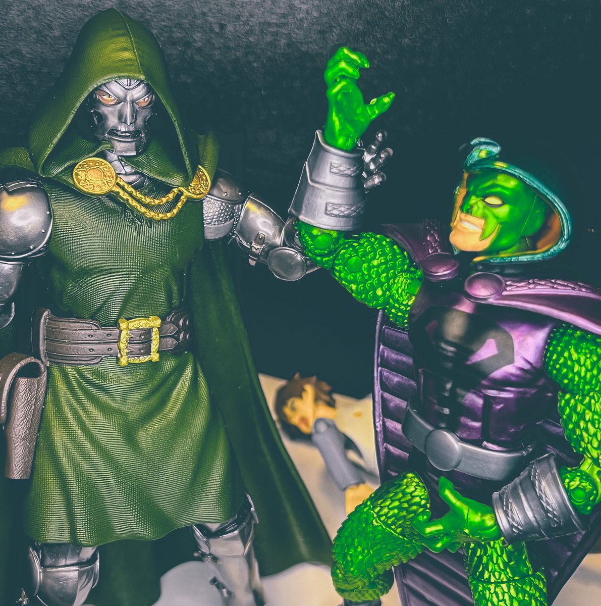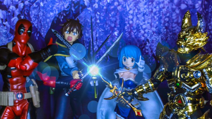 #夜のフィギュア撮影会 #ハリセンバース 2/10テーマ「ファンタジー」 "ファンタジー"世界の 剣士による同盟結成 牙「我ら世界は違えど!」 さ「心に秘めた願いは一つ!」 デ「そう!映画グリーンランタンの続編さ!」 カ「誰!?」 使用フィギュア ・SHF 牙狼 ・figma さやか カズマ デッドプール