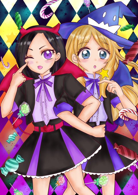 #ハロウィンイラスト #おしゃまトリックス #キラッとプリチャン #イラスト #2次創作 #みんなで楽しむTwitter展覧会 #絵描きさんと繋がりたい 大遅刻ですがハロウィンイラスト🎃描きました!!デヴィとルゥ💖✨