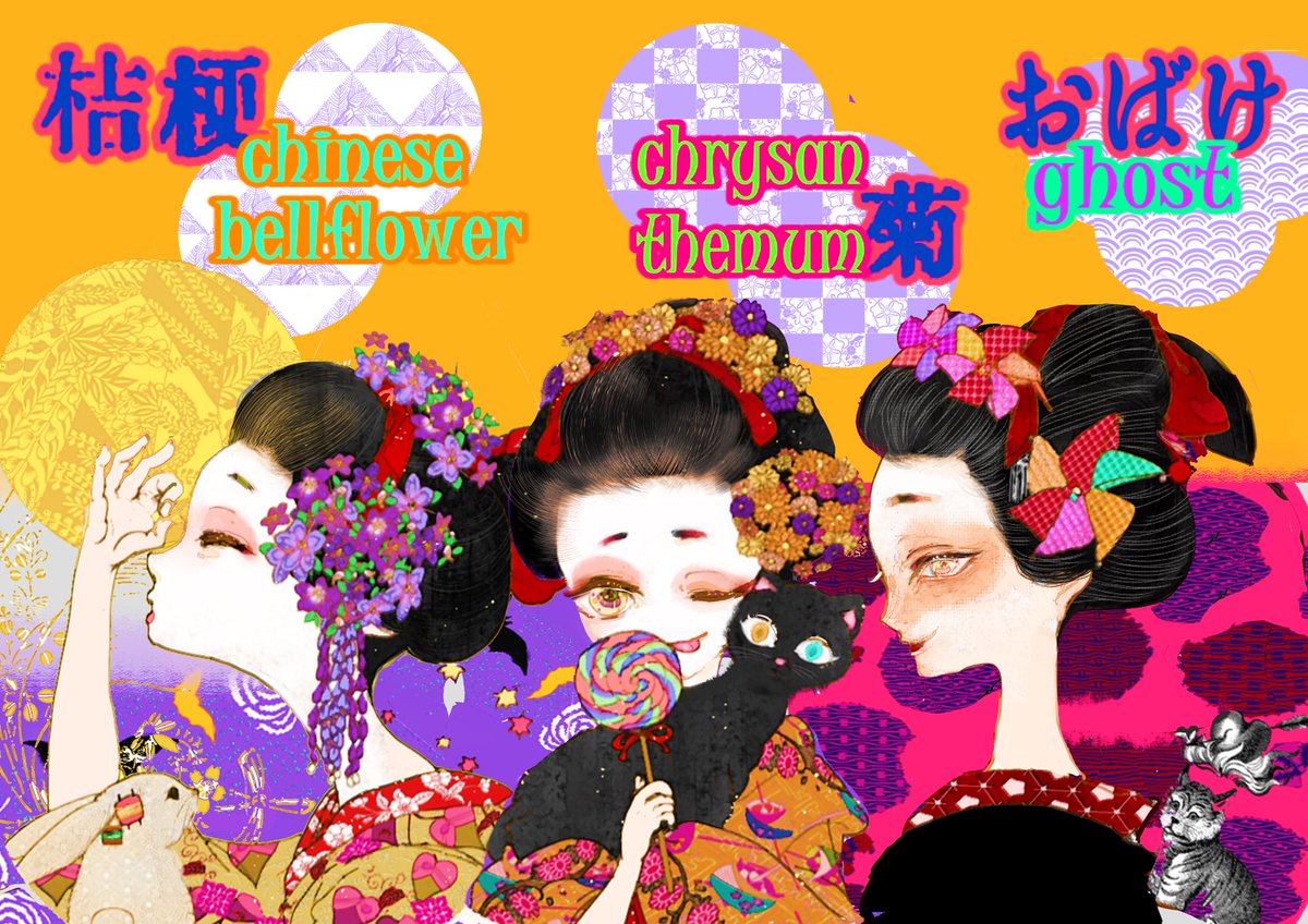 舞妓さん簪シリーズ 9月桔梗、10月菊 舞妓さんのハロウィンっぽい2月のおばけです #ハロウィン2021イラスト・創作祭り #HappyHalloween2021 #ハロウィンイラスト展示会 #秋の創作クラスタフォロー祭り #絵描きさんと繋がりたい #私の絵柄が性癖に刺さる人に届いてほしい