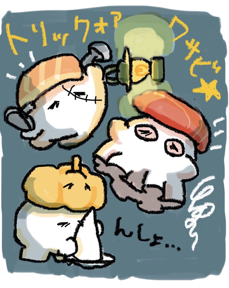 #ハロウィン ハッピーハロウィーン!🎃🍣 ワサビをもらいに、すしだまたちが皆さんのもとにお邪魔します🍣👻 ワサビをもらうとお家の前に厄除けの塩を盛り、もらえないと……米粒を鍵穴に入れます! #ハロウィンキャラ百鬼夜行イラストフェス2022