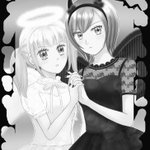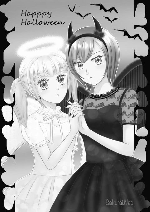 今日は #天使の日 1年前に描いたハロウィンイラスト をモノクロにしました🎃 天使の純奈と悪魔のかれん👼👿 今年もこの2人にコスプレさせようと思います😊 タグお借りします #ハロウィン学園祭2021 #みんなのハロウィンアート