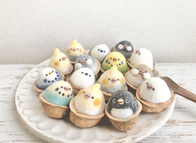 クルミのことりさん♡ それぞれクルミの殻にすっぽり 入ってコロコロしてます^ ^ 「Handmade MAKER'S w MAKER'S with minne」 4月28日(木)・29日(金・祝) 東京ビッグサイト minne-26 #羊毛フェルト #ハンドメイドメイカーズ