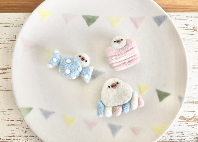 スイーツ文鳥さん♡ キャンディ マカロンからひょっこり文鳥さん マシュマロにまったり文鳥さん すべてブローチです☆ 「Handmade MAKER'S with minne」 4月28日(木)・29日(金・祝) 東京ビッグサイト minne-26 #羊毛フェルト #ハンドメイドメーカーズ #文鳥