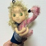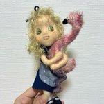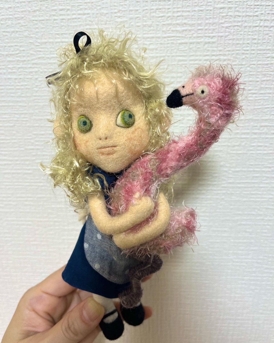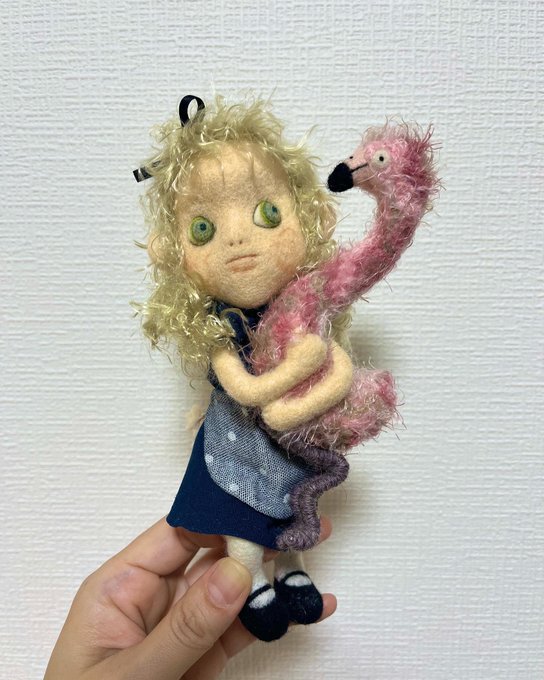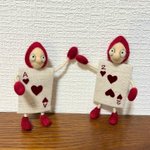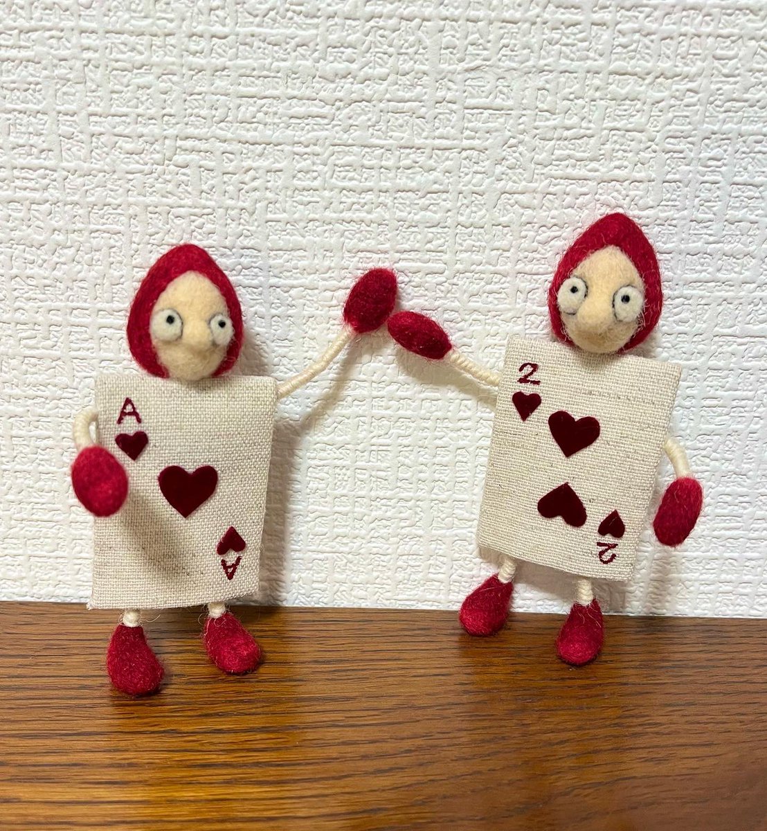 「#不思議の国のアリス」完成しました! 丸い木の上に所狭しと乗っています。クロケットのシーンです。 手にはスティック代わりのフラミンゴ、足元にはボール代わりのハリネズミ、アリスの両側にハートのトランプも配置しました。 #羊毛フェルト #needlefelting #ハンドメイド人形 #人型 #人形制作