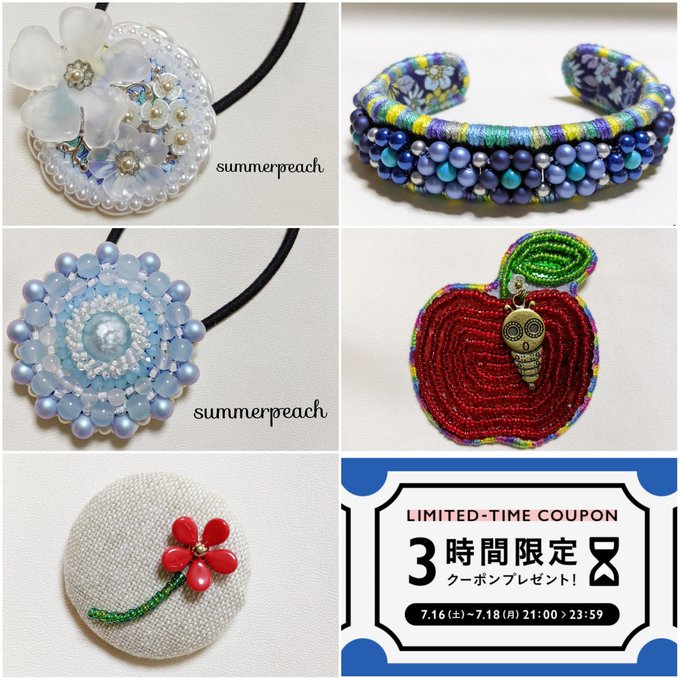 土曜日より、お得なクーポンが出るそうです😊 今の暑い時期にピッタリなヘアゴムやバングル、いつも一緒にお出かけ出来るブローチなど取り揃えてお待ちしております😊❤️ #ハンドメイド好きさんと繋がりたい #夏の創作クラスタフォロー祭り summerpeach's GALLERY #minne minne.com/@abibubagon