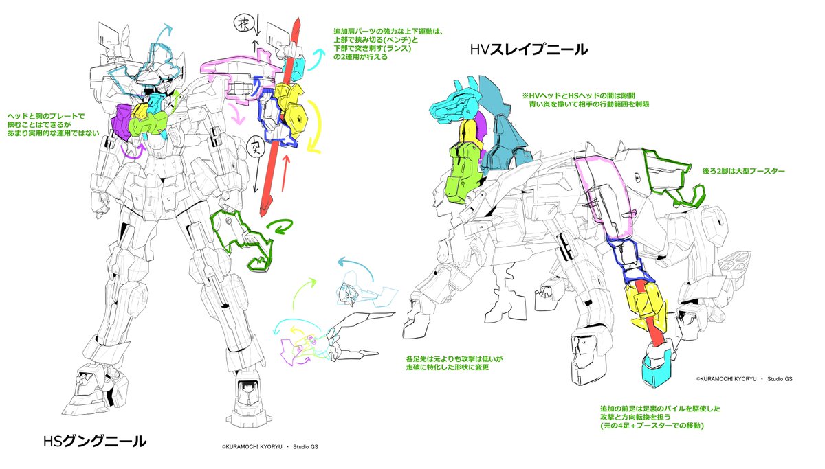 【オリジナル武装部門】 【作品名:アトリーズモジュール】 【応募要項に同意します】 一部パーツ換装で異なる獣性と運用が可能になった機体 HSは機動性を落とす代わりにランスとペンチでの瞬間火力を、 HVはパイルを操る8足軍馬になり炎を撒きながら相手を追い詰める #ハンドレッドエッジコンテスト