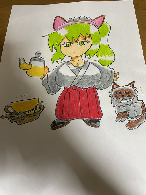 #一日一絵 #毎日絵一枚上げる #イラスト #色鉛筆画 #オリキャラ #イラスト好きな人と繋がりたい #絵描きさんと繋がりたい #ハーブの日 香草香幸温 香草猫神社の巫女であり好物はハーブティー ハーブの薬草をいっぱい持っておりお参りに来た人にあげてるらしい