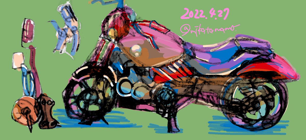最近の #日記 🏍 バイク描いたよ🛵かっちょいー 普段使わない色を意識してみました🍉 #イラスト #絵 #芸術の輪 #art #絵描きさんと繋がりたい #創作 #絵日記 #illustration #drawing #バイク #bike #ハーレー #hurley #ibisPaintX #イラストエッセイ #イラスト好きさんと繋がりたい