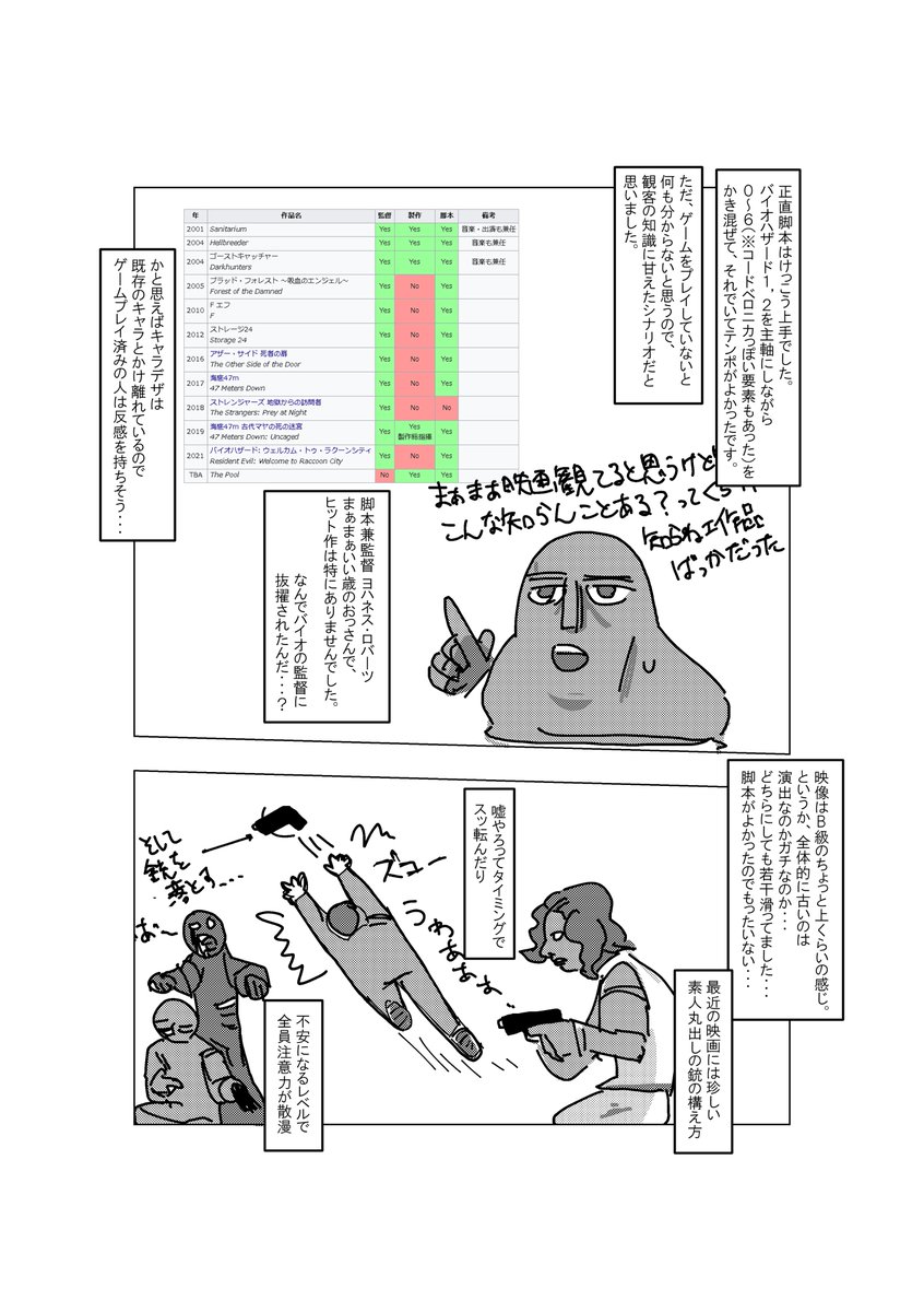#バイオハザードウェルカムトゥラクーンシティ バイオハザードの感想 バイオハザード2を主に扱ってますが、0~6まで(※コードベロニカやReシリーズを含む)バイオハザードをプレイしていないと楽しめない映画でした。 個人的にはそこそこ面白かったです。