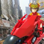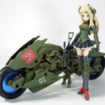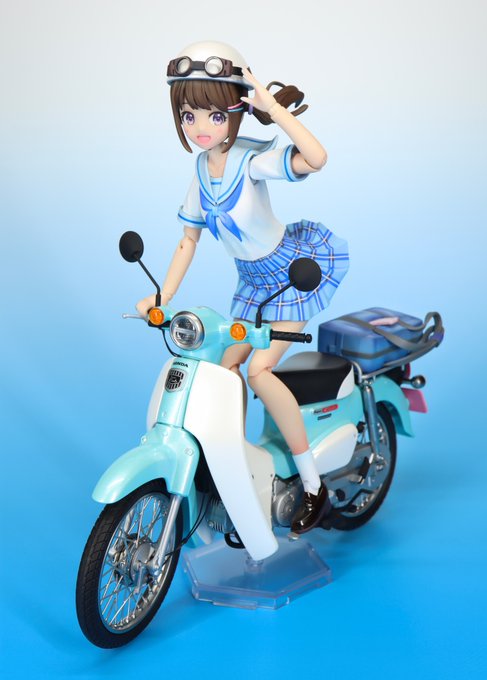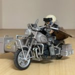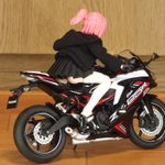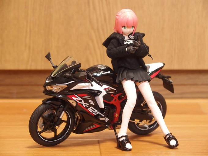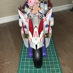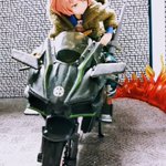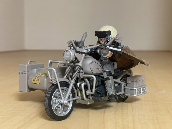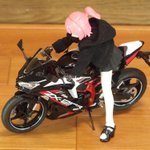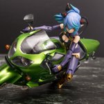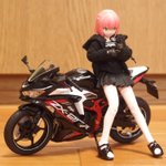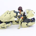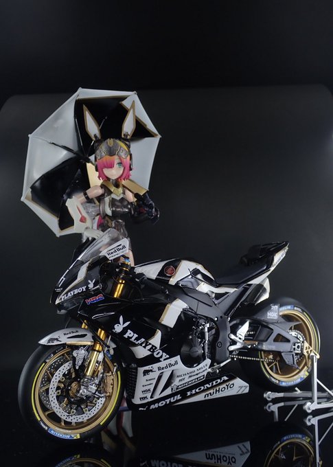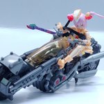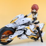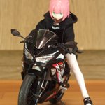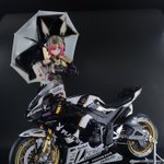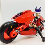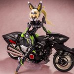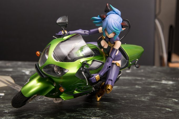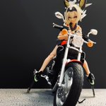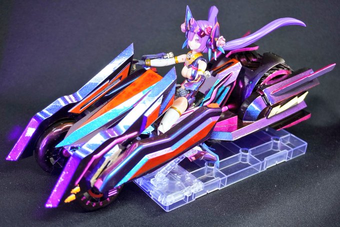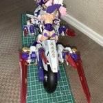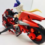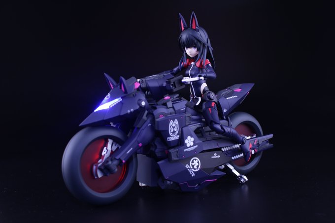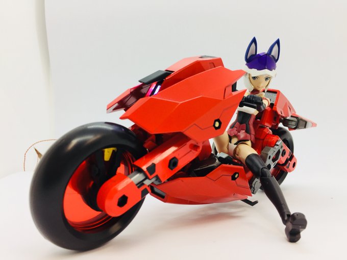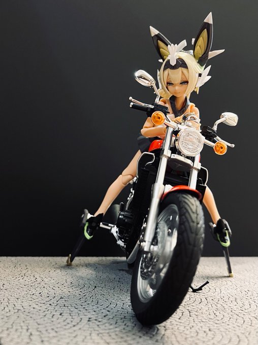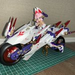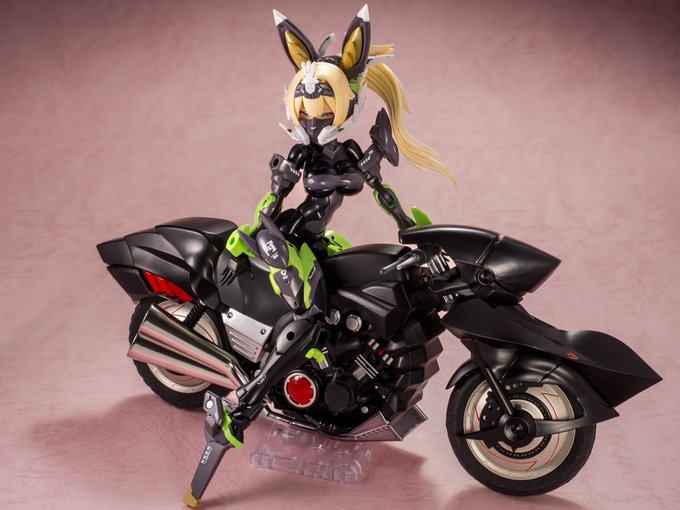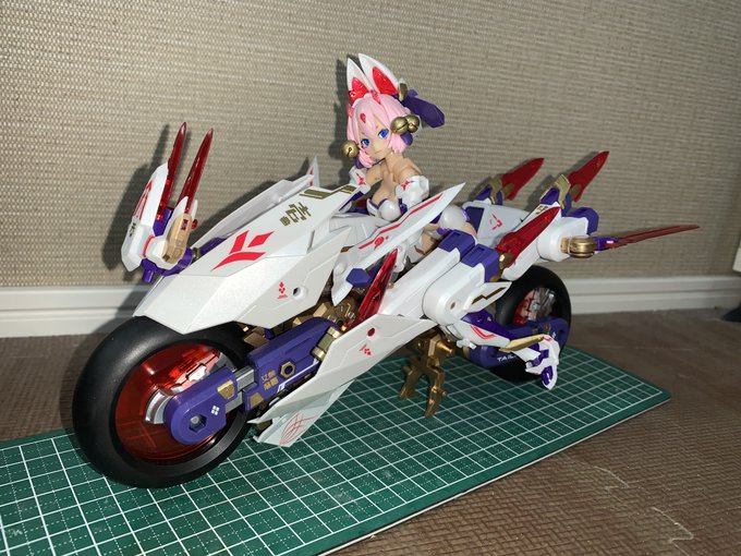 九尾レイダーも出来ました パーツをどうやって付けるか思考作した結果、正面から見ると狐面っぽく見える形に収まって満足! #メガミデバイス #バイクと美プラ twitter.com/hagure512/st…