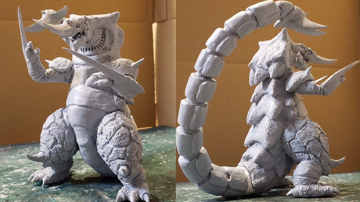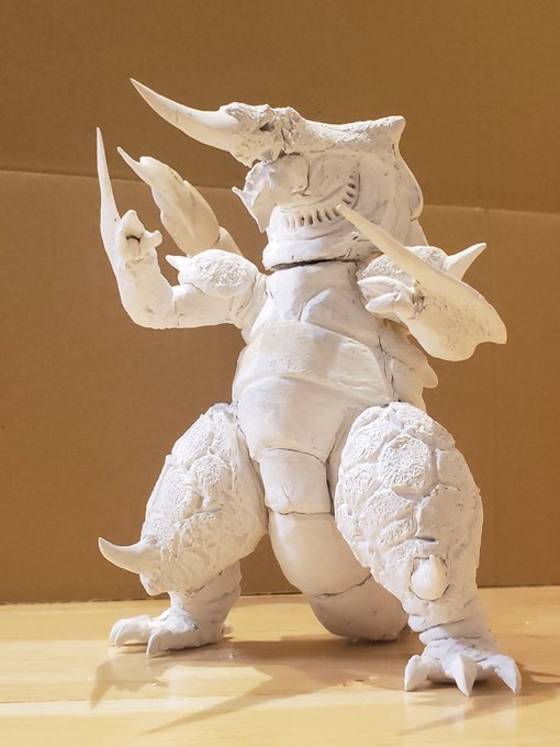 裂刀怪獣バギラ16日目、細かい調整して溶きパテ塗ってほぼ外形完成です。一部関節部分の隙間埋め中。縫いぐるみはほどほどにトレースしつつ、自分の中のカッコいいバギラのイメージにできたかと思います😊そんなわけで次はこれかな。。#バギラ #電光超人グリッドマン