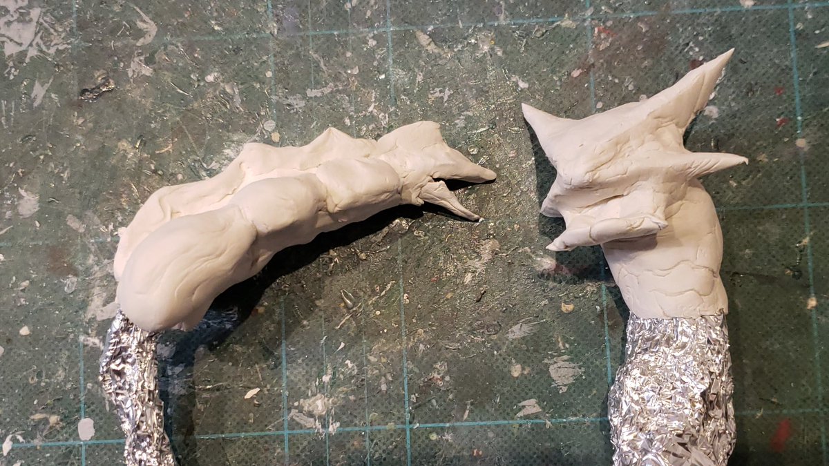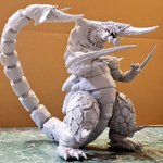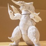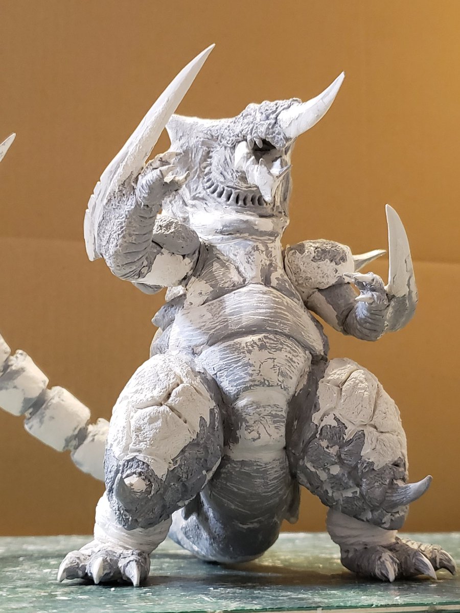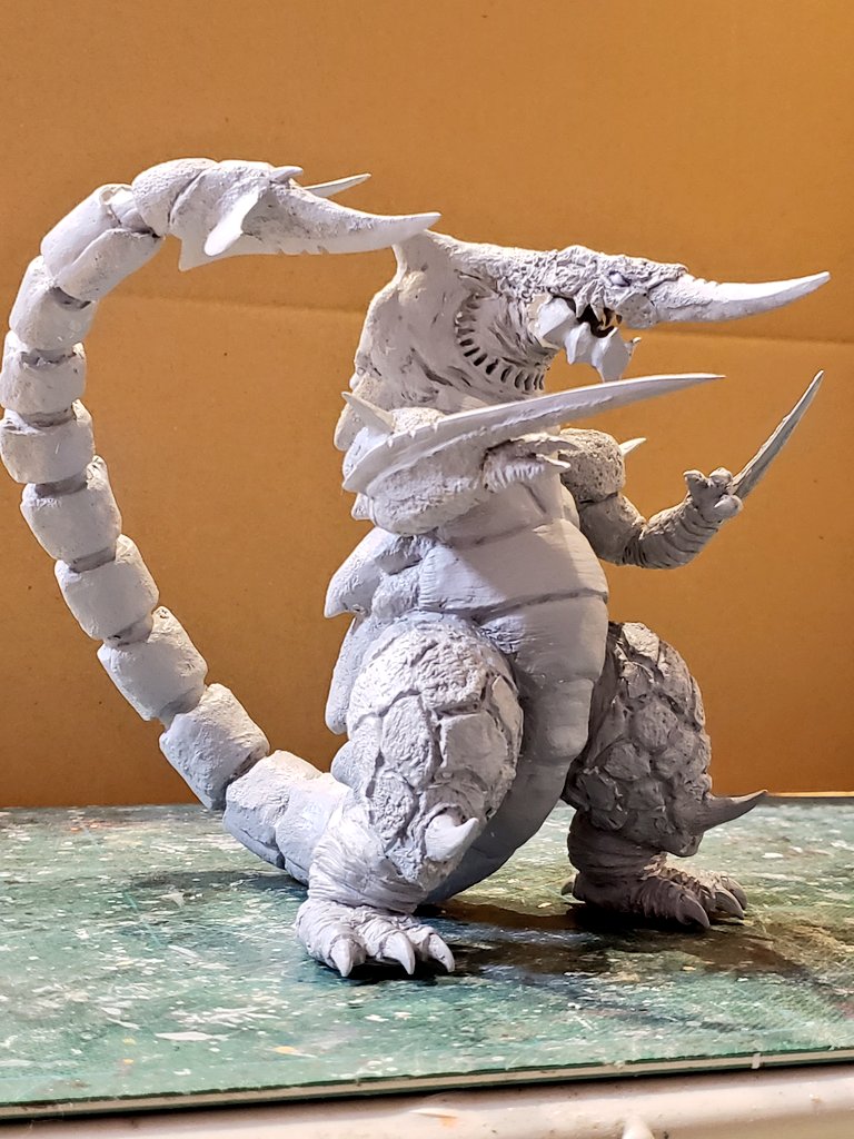 だいぶ見えてきた裂刀怪獣バギラ7日目!ほぼ体表の彫刻が終わってきました。雰囲気は似てきたかと。尻尾もざっくり盛りましたがちょっと太いのと細部はこれからです。 あげ方や見え方ももう少し調整しないとですね。ファンドの白さだと細部がなかなか見えないかな😅 #バギラ #電光超人グリッドマン