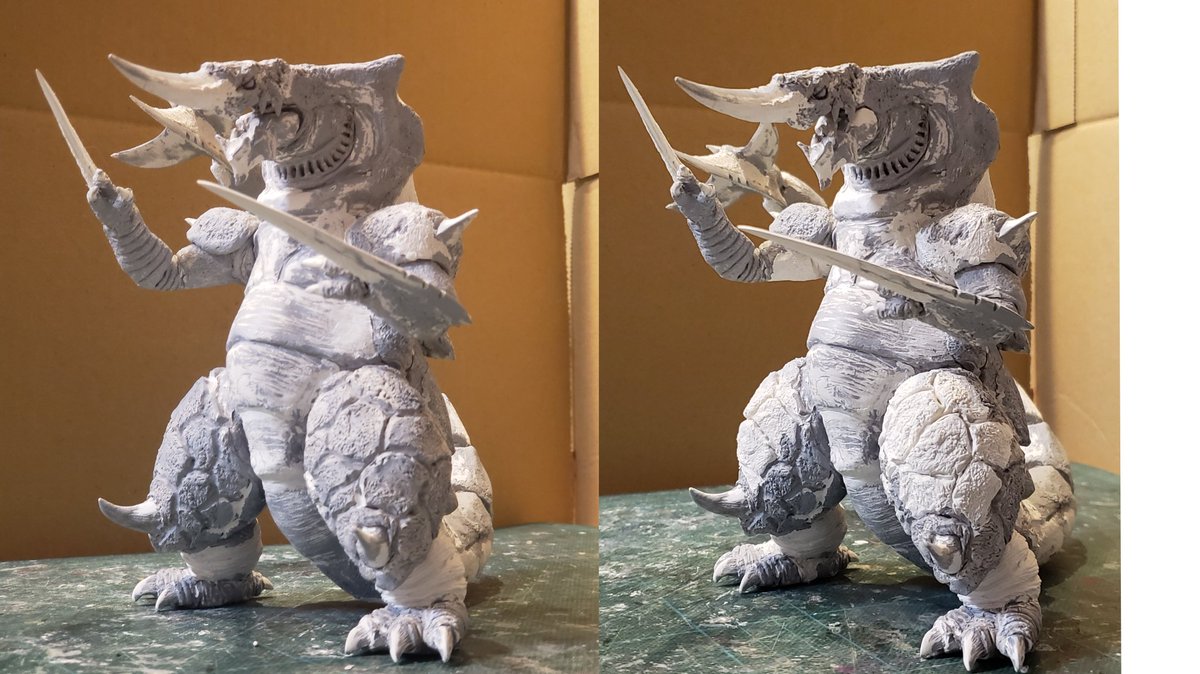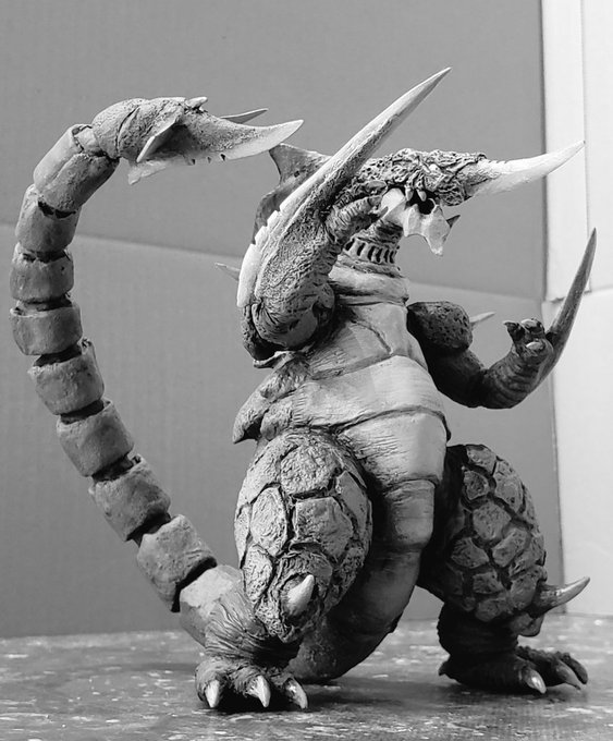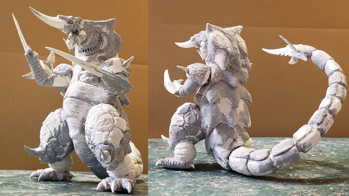 仕上げまで一通りできたので、今夜撮影して、グリッドマン怪獣シリーズ第3弾、アノシラス(通常&変身)VSバギラ(改造)の完成ツイートします!よろしくお願いいたします🙇 #アノシラス #バギラ #電光超人グリッドマン
