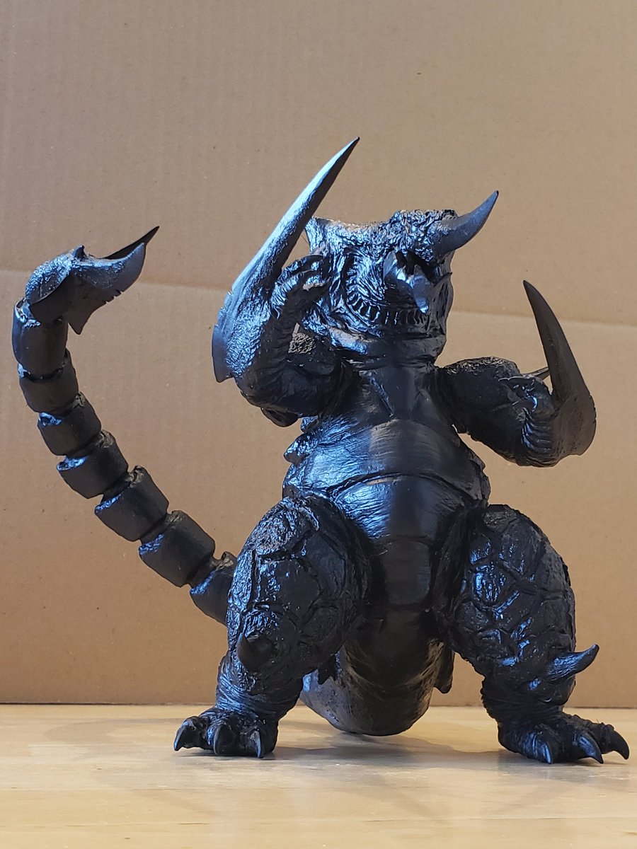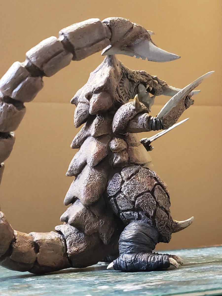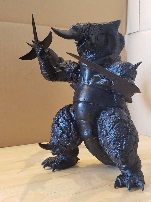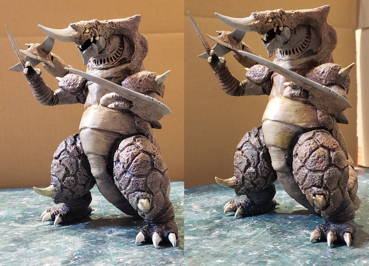 裂刀怪獣バギラ18日目。塗装に入りました。黒立ち上げでなかなか色が乗りきらず影黒好きだったので、ウォッシングで影色つける方法に。2、3枚目は左手1層目、右ウォッシング後です。コートしてまたドライブラシします。 #バギラ #電光超人グリッドマン