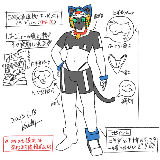 テトちゃん(@f_f_bastet)の非公式設定画 パージver. (2023/6.18) いつぞやの放送でコメントした脱衣版。 現状、僕の脳内設定で公式設定ではないです! ないです!(大事なry この呟きが消えた時は、くろこしぉーが動き出した時よ♥💀♥ #ロボとみんな #ロボとみんなとここだけの話 #バステトお絵描き