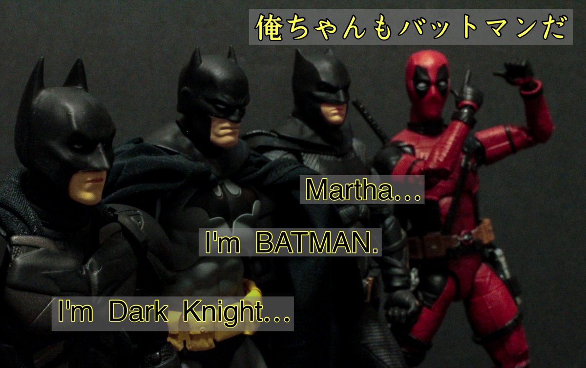 #オモ写 #バットマンの日2022 #お笑いフィギュア劇場 デッドプール2(映画)のとあるワンシーンをオマージュして。 使用フィギュア MAFEX バットマン(ダークナイト) バットマン(HUSHver) バットマン(DCEU) ML・SHF デッドプール(カスタム)