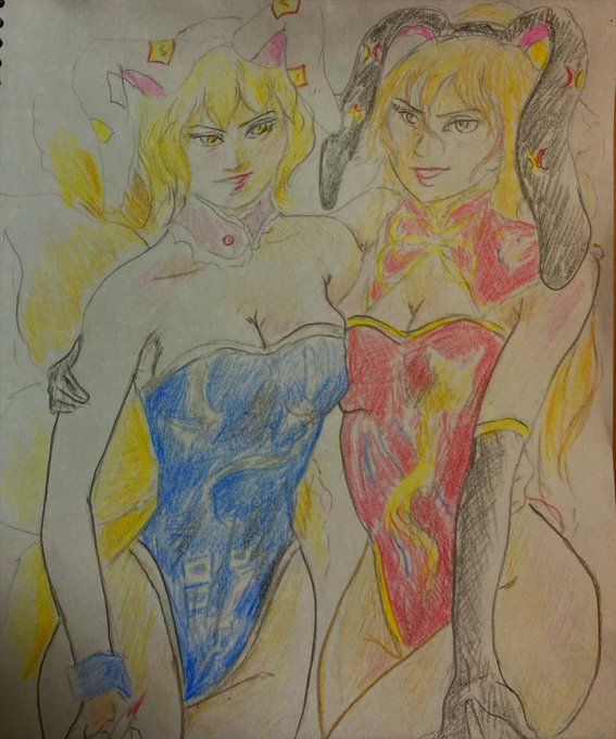 隠岐奈『紫よ見ているか⁉︎』 純狐『ちょっ…それ私のセリフ!』 普通の #バニースーツ でも良かったかなって 終わってから思ったりする… #深夜の真剣お絵描き60分一本勝負 #摩多羅隠岐奈 #東方project #アナログ絵