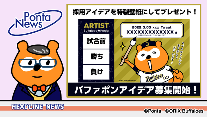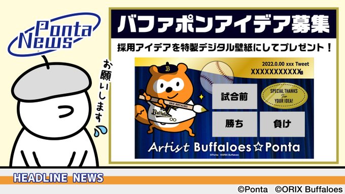 \今シーズンもアイデア大募集⚾/ 恒例となる #バファポンアイデア募集 がスタートしました!!日本一目指して、アイデアのご応募をお待ちしております。 採用者には、特製デジタル壁紙をプレゼント✨ ■くわしくはこちら➡ponta.jp/c/buffaloes/#S… #バファローズポンタ