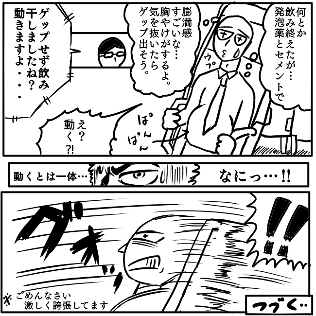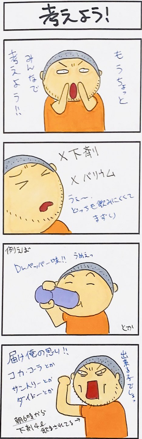 バリウム検査体験しましたよ。 未体験の方々は参考にしてもらえると嬉しいです(⌒∇⌒) なお続きます。 #エッセイ漫画 #漫画が読めるハッシュタグ #漫画好きな人と繋がりたい #4コマ漫画 #4コマR #イラスト #バリウム #健康診断