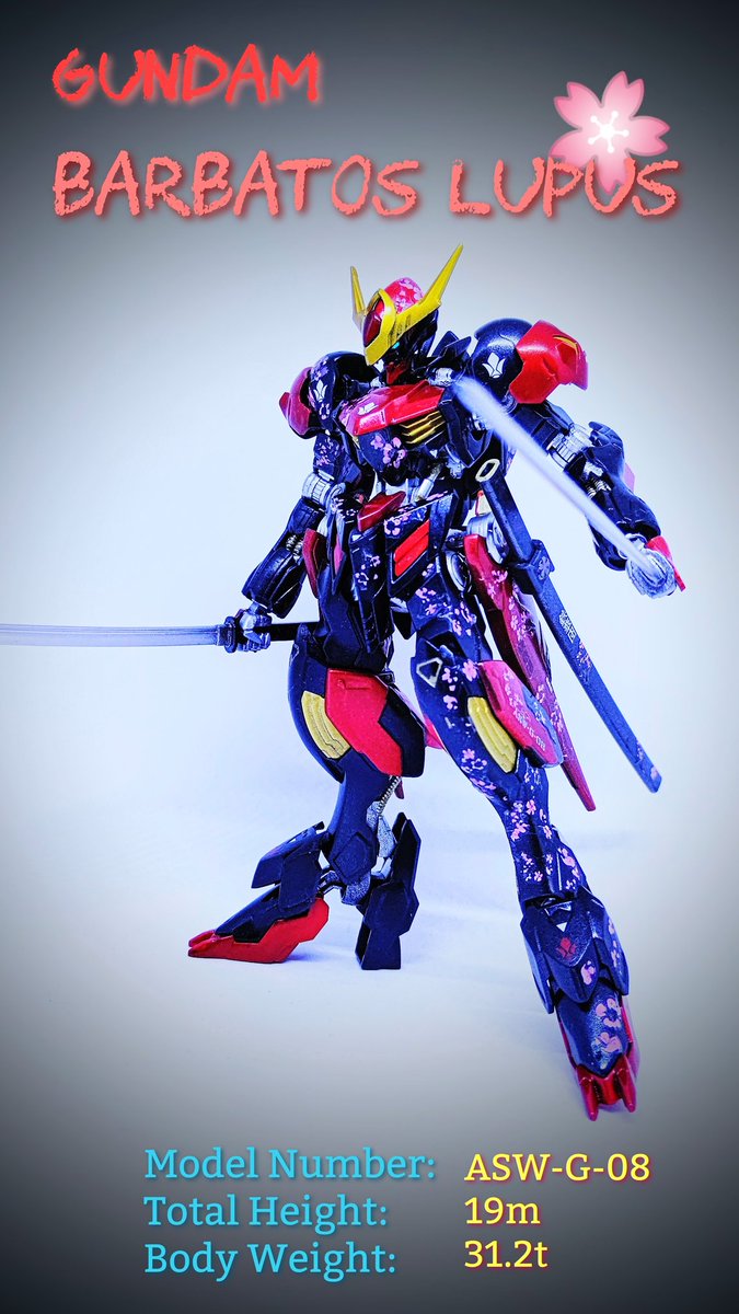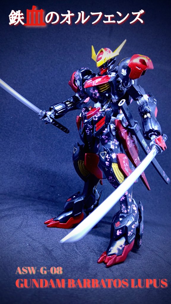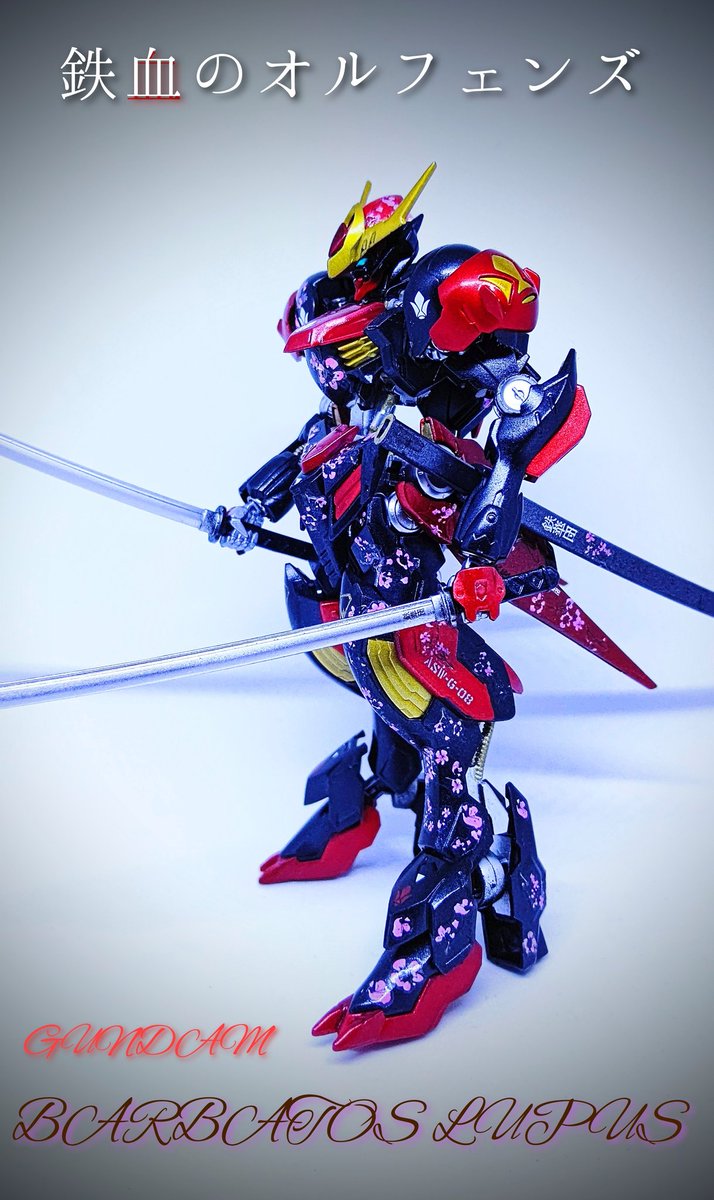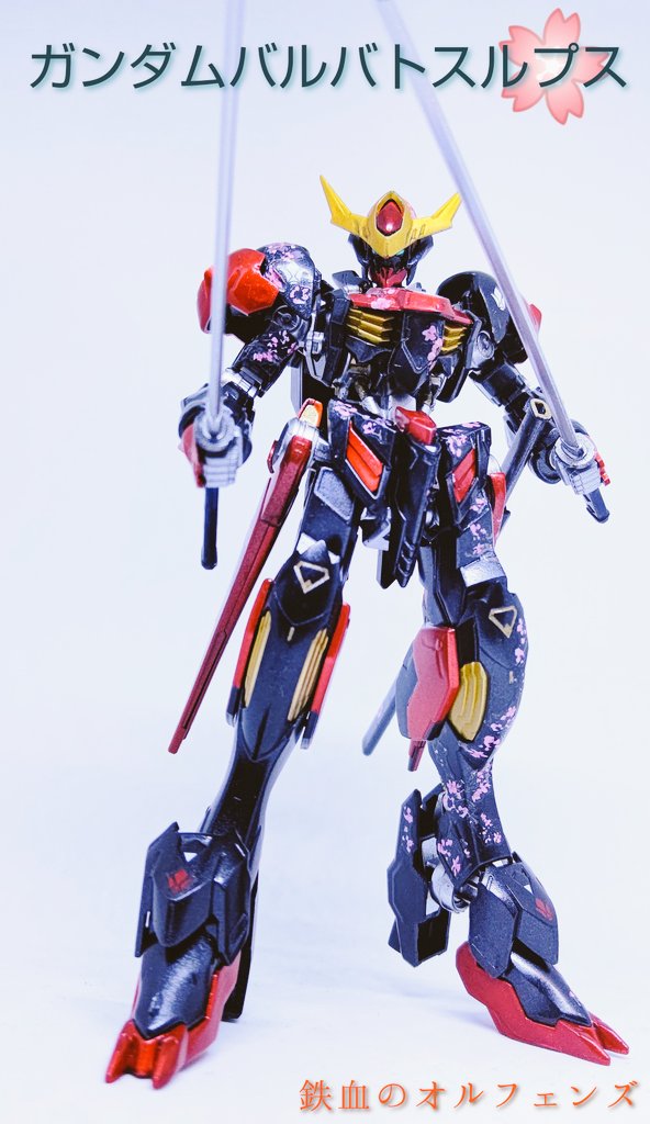 HG #バルバトスルプス 完成!! 黒をベースに鉄血の赤で表現してみました。 以前フォロワーさんから、桜柄が血しぶきに見えたとのコメントがあったので、今回は敢えて返り血の様に配置し、武器も刀にしてみました #ガンプラは自由だ #ガンプラ好きと繋がりたい #ガンプラの画像貼るとRTされると聞いて