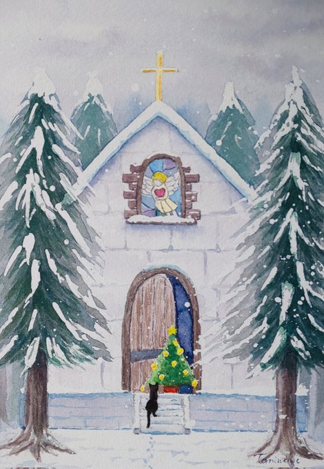 遅ればせながら #バレットジャーナル 12月の扉絵は水彩画で森の中の小さなクリスマス フツーにファブリアーノエクストラホワイトに描いちゃったので切ってノートに貼る ほぼW&Nの3原色縛りで久しぶりに描いた……楽しい…… 自分、意外にこんな絵も描けるんだなあと楽しかった✨ #水彩画