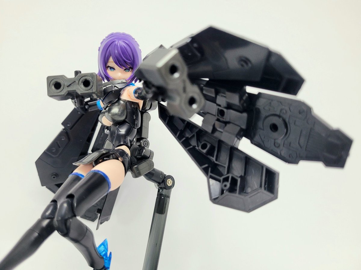 ということで、新作BKエクソシスト【FALLEN】の完成っす! エクソシストを近距離戦闘仕様にカスタマイズ、本来の装甲をごっそり減らし、腰部及び背部ブースター【血染めの花嫁】による強襲を得意とするメガミとしました #メガミデバイス #バレットナイツ #バレットナイツエクソシスト