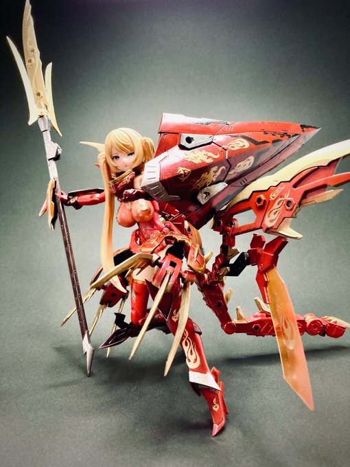 先日余りパーツから捻り出した素体と、買ったものの上手く活用できてなかったM.S.G.のリュウビで新たな娘を作りました!ランサー・紅龍ちゃんです! ランサーと言いつつ顔はウィドウちゃんだしあんまり要素無いけど、メイン武器槍だしいいよね?! #メガミデバイス #バレットナイツランサー