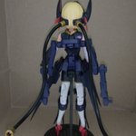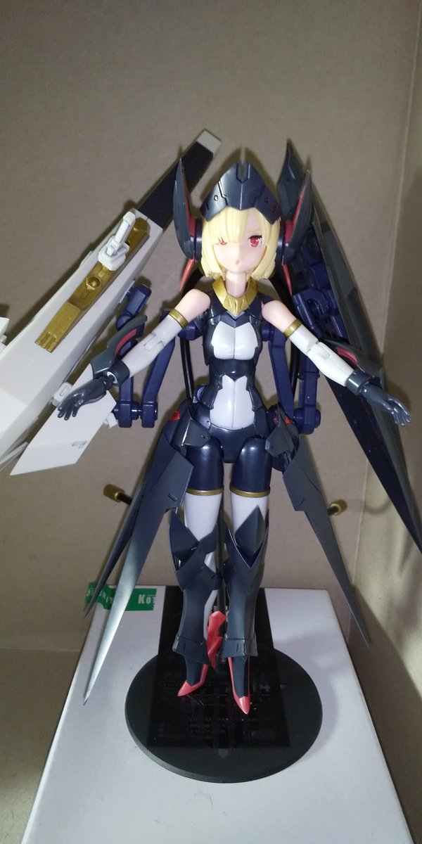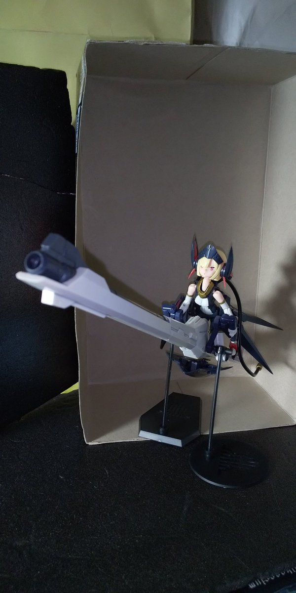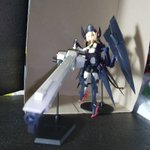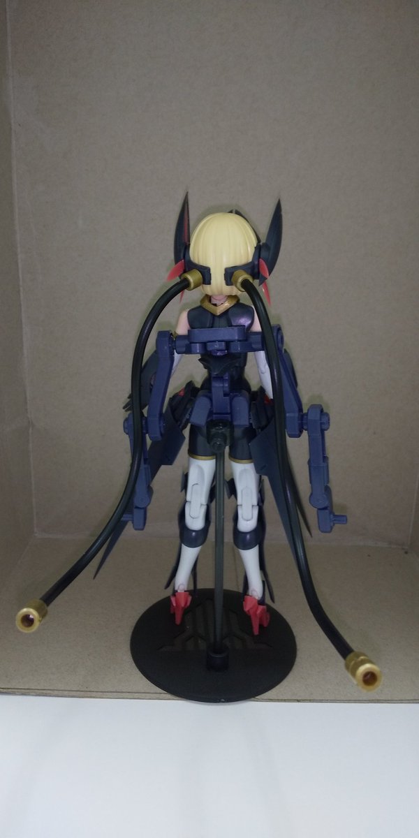 作成中に一枚。 武装状態の後ろ頭から、フレキシブルに動かせる結構硬めでしっかりしたコードが伸びててそれで武器保持とかさせるみたいなんですが。 首状態だとそれで立たせられたw #く美プラ #メガミデバイス #バレットナイツランチャー
