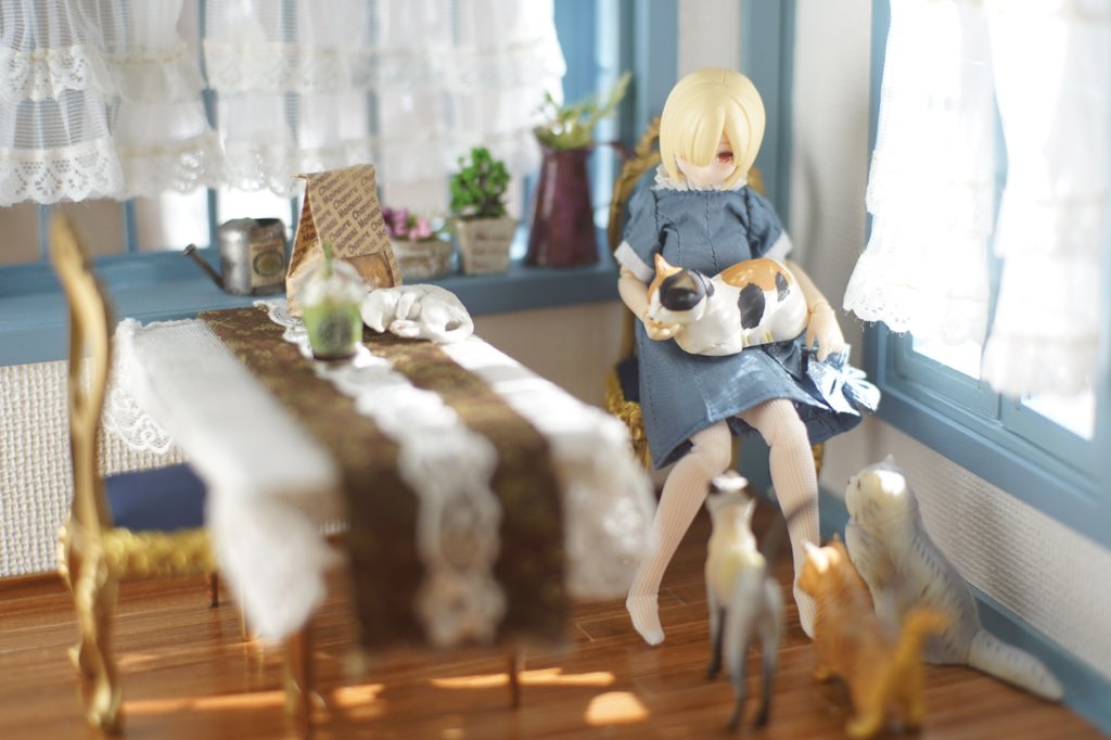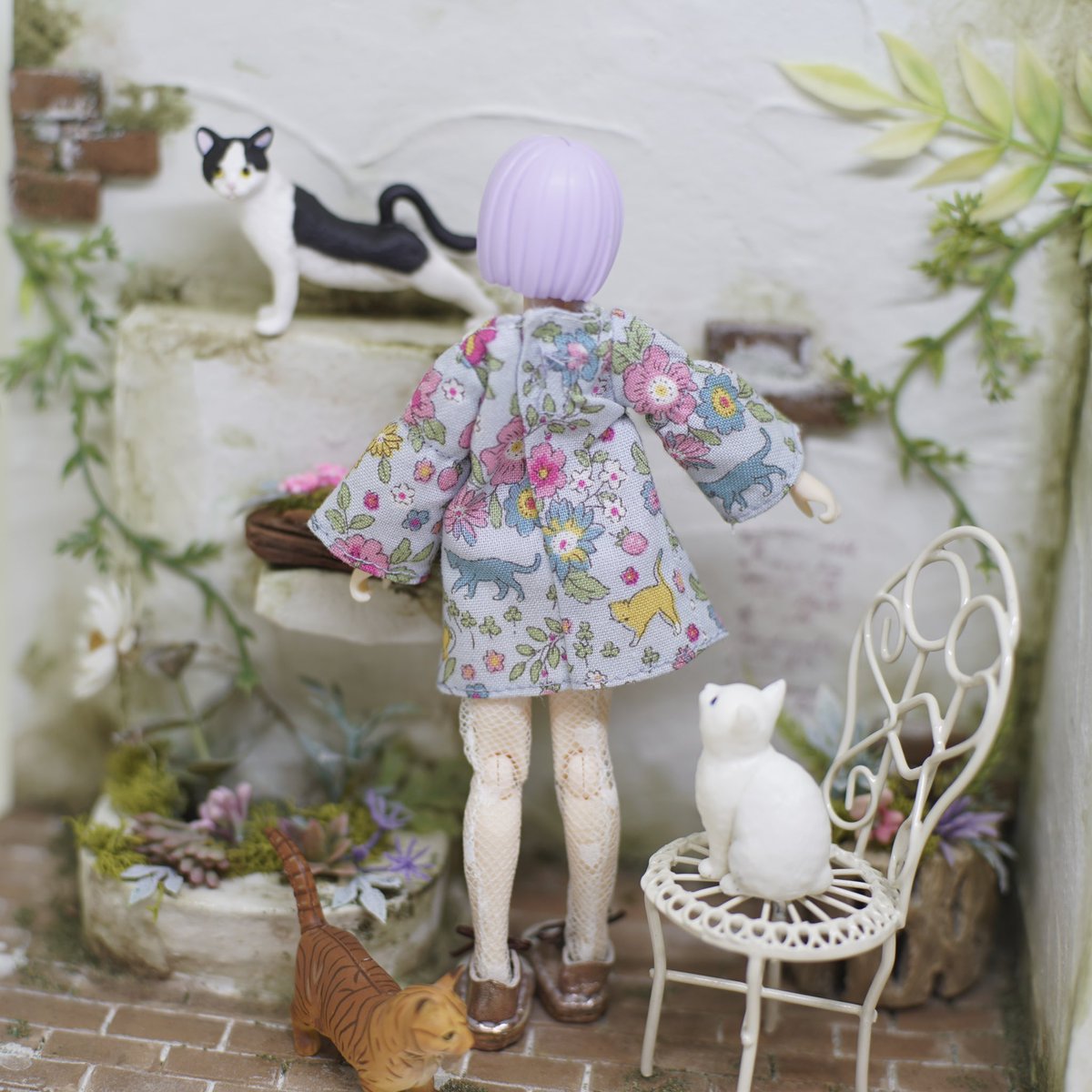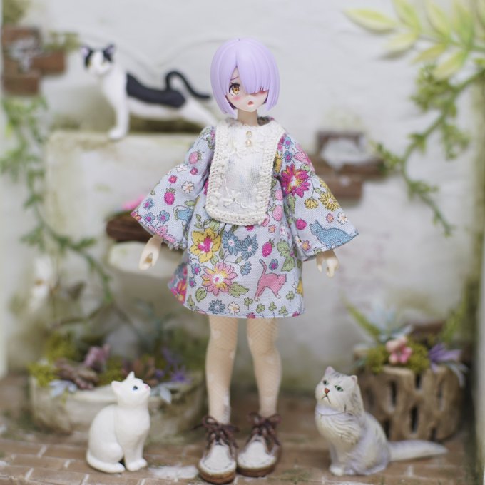 花&猫柄のゆるゆるなワンピースつくってみました!2個め!🌼👗🐾 前回の服と袖やヨークをちょこっと変えてみました。 . #メガミデバイス #ハンドメイドドール服 #バレットナイツランチャー