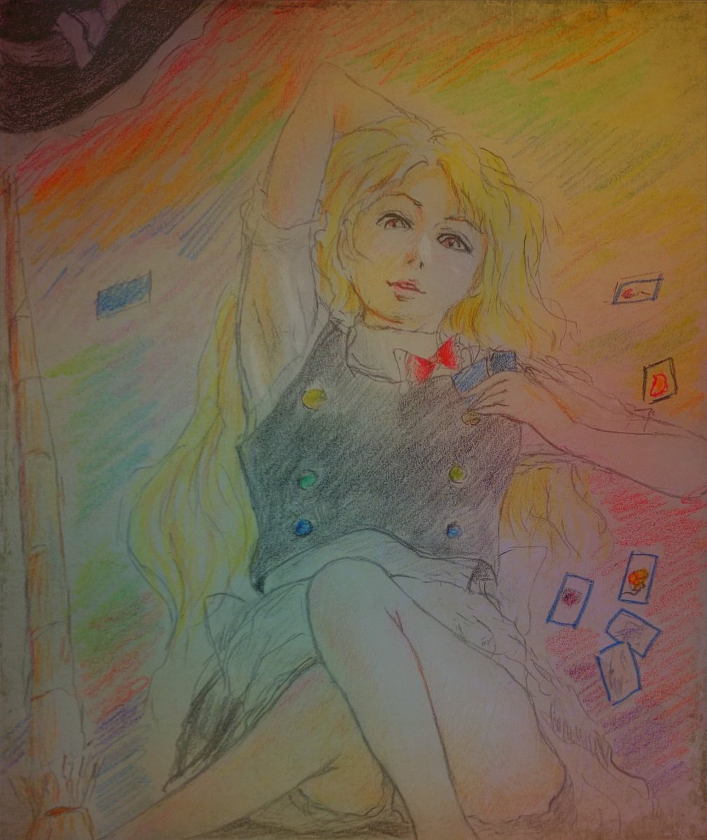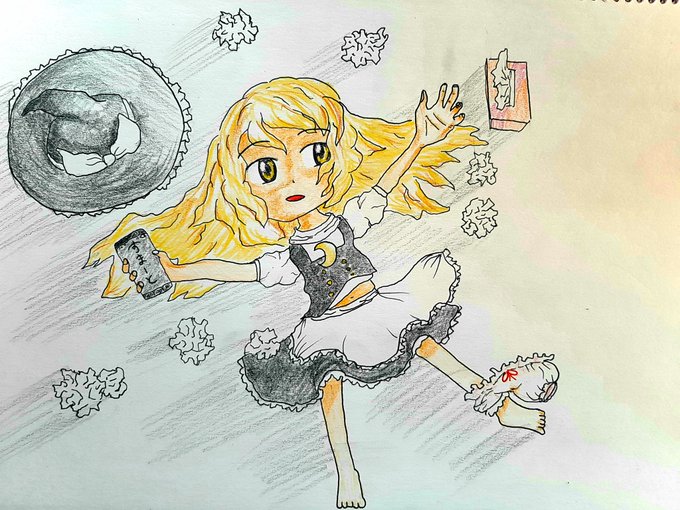 魔理沙ちゃん主役自機おめでとう 背景レインボーペンシルでテキトーに …また大人びた感もするけど気のせい? #バレットフィリア達の闇市場 #霧雨魔理沙 #魔理沙主役 #東方project #アナログ絵