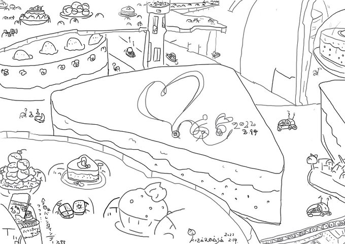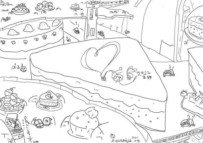 #バレンタインデー #バレンタインデーイラスト え〜久方ぶりの絵本イラストです。 魂ちゃんのバレンタインデー2022✧◝(⁰▿⁰)◜✧ 物語的には お菓子厨房都市から 巨大飛空船に 運び込まれる チョコレートケーキたち。