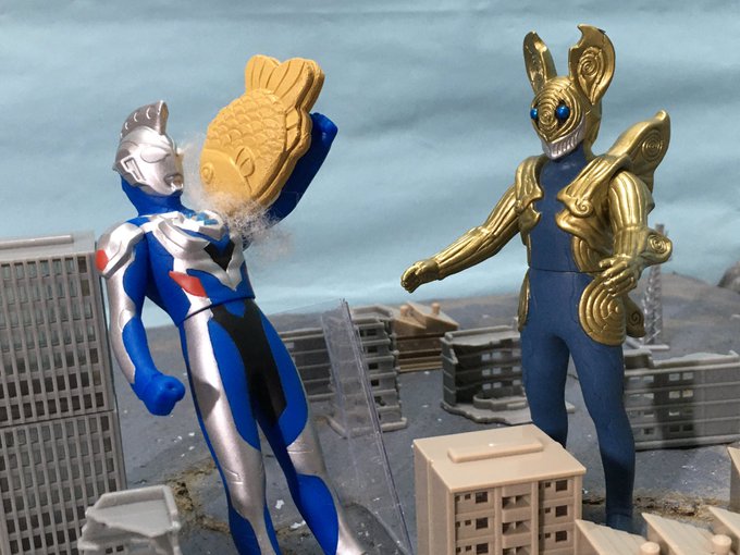 #夜のフィギュア撮影会 お題『格闘』 鯛と格闘するウルトラマンZ!?商売繁盛!商売繁盛!コダイゴンジアザーの鯛! #ウルトラマンZ #バロッサ星人 #ソフビ (← #ウルトラマントリガー 7話を再現!?) #オモ写