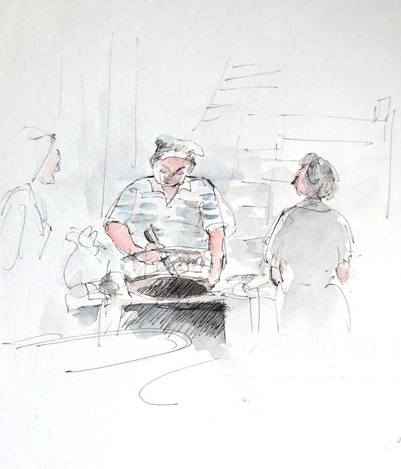 #りえこさん冒険の思い出 その551 タイはバンコク。朝晩は屋台での食事が多い。昼はちょっとした食堂に入る事も。トムヤムヌードルが美味しかった食堂の2階から見下ろせた厨房が楽しい〜かな。 #絵 #人形 #旅 #水彩画 #スケッチ #watercolor #タイ #バンコク minne.com/@ritakahashi4