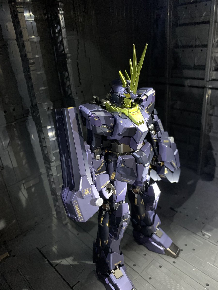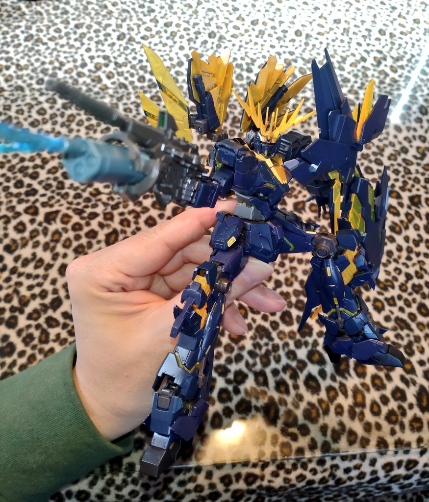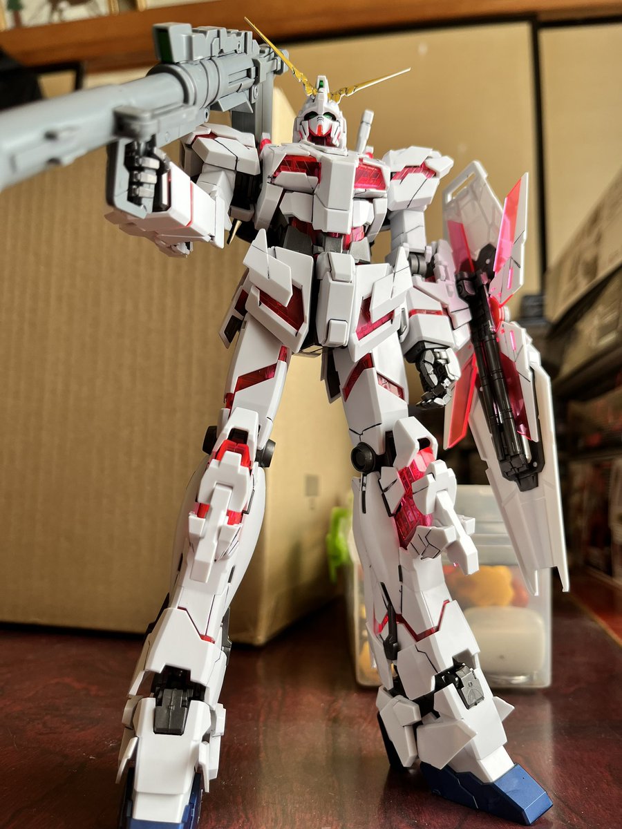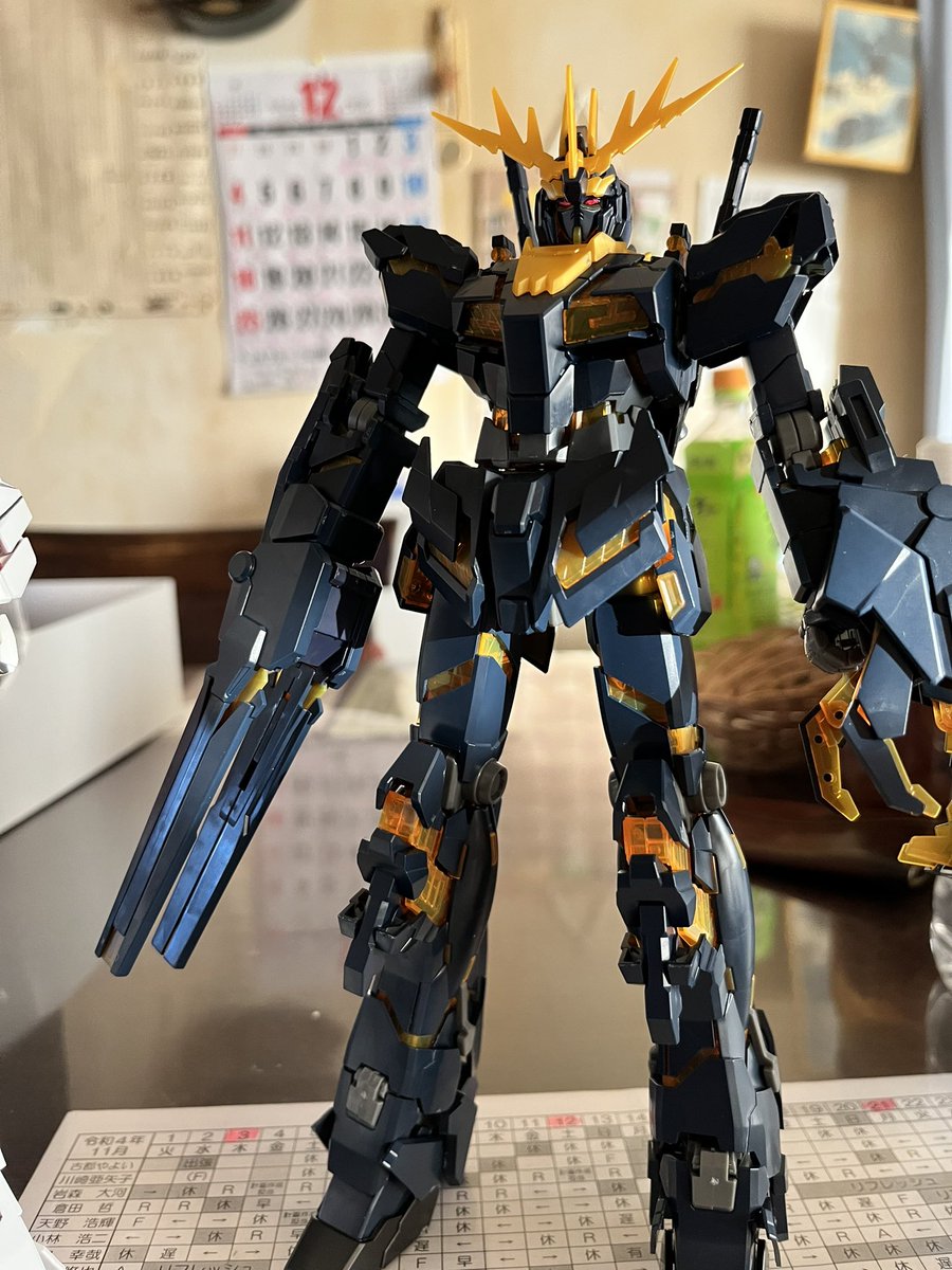 一夜明けて 達成感の余韻に浸りながら朝からポージングさせる中年 そして家族の冷たい目 #ガンプラの画像を貼るとRTされると聞いて #ガンプラ好きと繋がりたい #バンシィ #光の結晶体 #ユニコーンガンダム