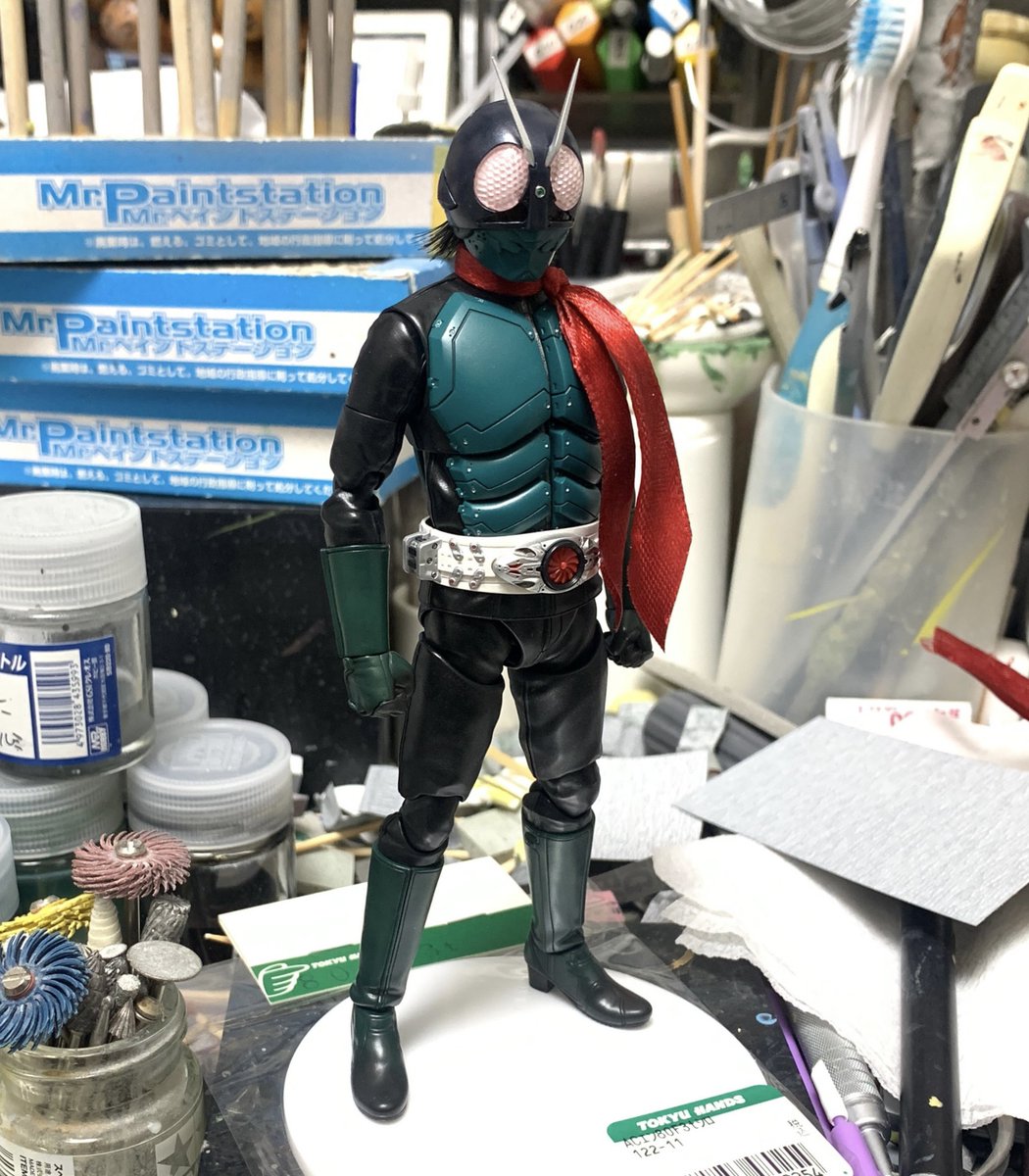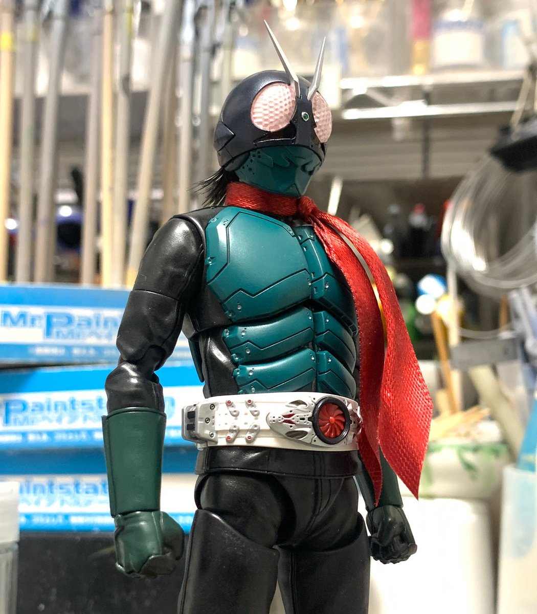 はい!仮面ライダー第2号、あらためて完成です!#バンダイ #フィギュアライズスタンダード 仮面ライダー(#シン・仮面ライダー)をベースに専用のタイフーンとブーツを制作、プロポーションを長身細身体型に改修しスーツの帯を追加しました!