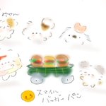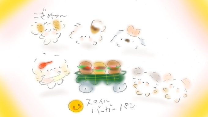 Hello💙バナバニー🍌🐰フレンズ ←こぎみゅん こなミミィ→ 「マルシェのパン屋さん」 オリジナル😊smileバーガー🍔 #絵描きさんと繋がりたい #サンリオ推しキャラ #こぎみゅん #バーガー