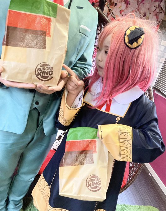 ちちとバーガーキング小樽店いってきた!ちちのほうがたくさんはいってる…ずるい…( ≖_≖) ジト目のアーニャ🥺 ※持ち帰りしたので撮影は自宅です🍔 #アーニャコスプレ #バーガーキング #バーガーキング小樽