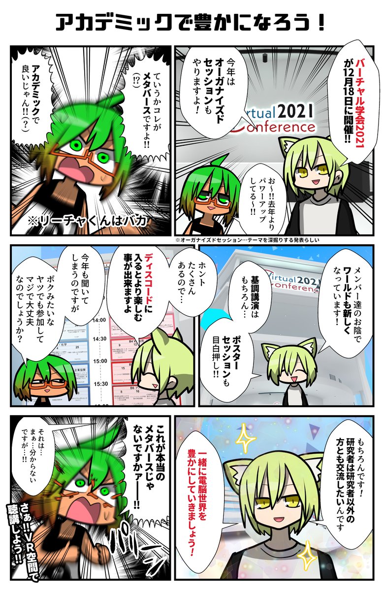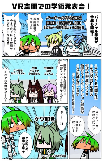 私がPR漫画を描かせていただいた #バーチャル学会 2022、本日より開催です! 学会ワールド内に私の漫画も掲示いただいている…とのこと!(動画にも映ってる!) 面白い発表と講演が目白押しなので、参加してみよう!VR機器がなくても、PCから気軽に参加できるよ☺️ 一緒に未来の熱量を感じにいこう! twitter.com/vsociety_offic…