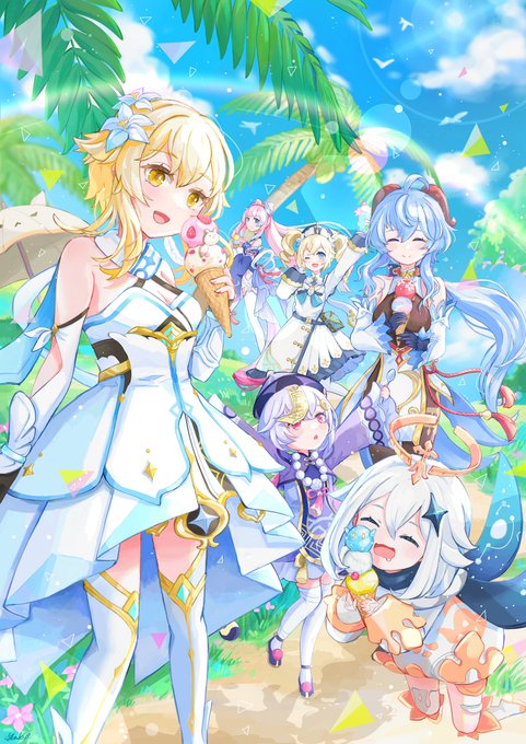 夜空に咲く大輪 #原神イラコン夏FA #GenshinImpact #原神 #パイモン(原神) #空(原神) #八重神子 #雷電将軍 #九条裟羅 #宵宮 #花火 pixiv.net/artworks/10060…