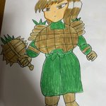 #一日一絵 #毎日絵一枚上げる #イラスト #色鉛筆画 #オリキャラ #イラスト好きな人と繋がりたい #絵描きさんと繋がりたい #パインの日 パインマツリン パイナップルの鎧を着た武装女戦士 武器はパインハンマースティック パイナップルが大好物🍍