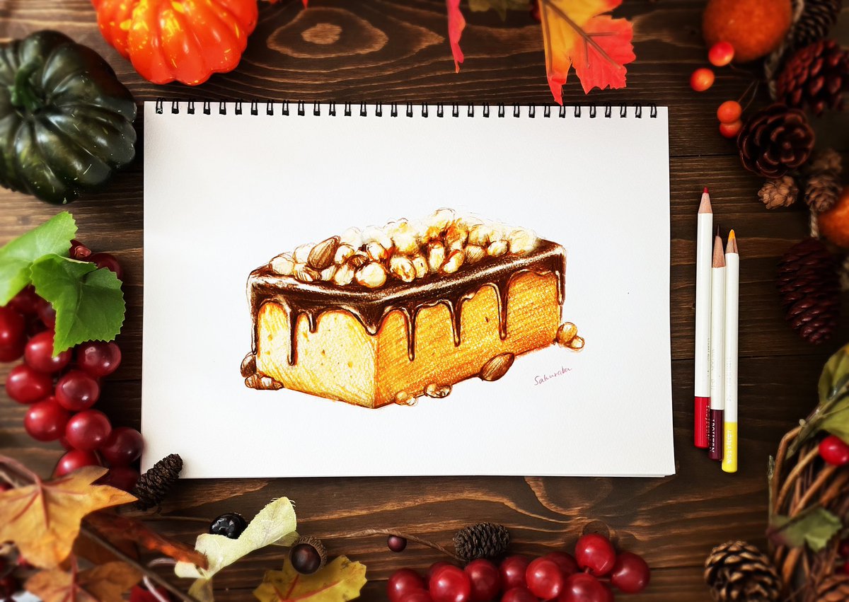 木の実のパウンドケーキ🍫🍁 フワフワのパウンドケーキに とろけるチョコレートと🍫 たっぷりの木の実をのせて🍁 #sakurabaCAFE #カフェ好きな人と繋がりたい #チョコレート #パウンドケーキ #色鉛筆 #イラスト #イラスト好きな人と繋がりたい #スイーツ好きな人と繋がりたい