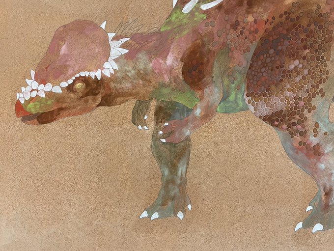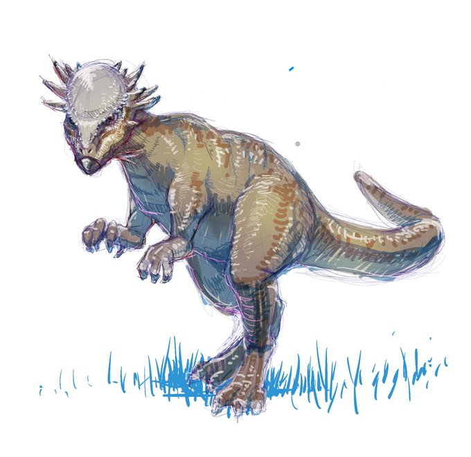 今日のお絵描き 雄同士で頭突きし合うパキケファロサウルス 唐突に描きたくなったので、勢いに任せて描いてみました!w パキケファロサウルスって雑食と言えど、咀嚼に向いてなさそうな顎から見たら意外と肉食味が強かったかもしれないですね〜 #パキケファロサウルス #ドラコレックス