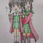#11月27日はパソ館たんのバースデー #パソ館たん 、お誕生日おめでとうございます!🎉🎂✨🎁✨(*≧∇≦)ノ🖥️🐈️ イラストは #池袋4姉妹 です。 また描きますね! #カメ館たん #本店たん #池西たん #ビッカメ娘 ( #ナイセン ) #ビッカメ娘を描き隊 #過去絵 #模写 #色鉛筆 #絵描きさんと繫がりたい