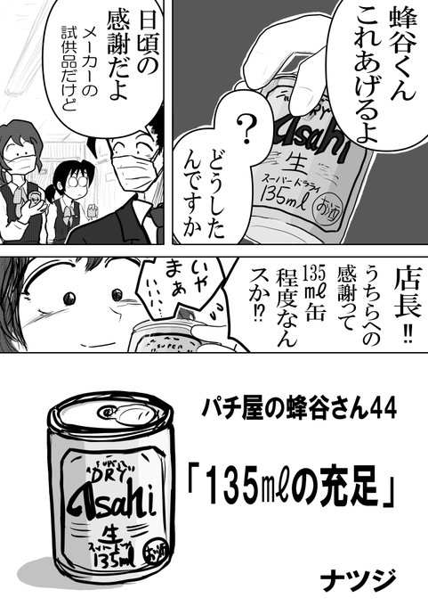 パチ屋の蜂谷さん🐝44話 「135㎖缶の充足」1/2 最終50話に向けしんどい展開が続くと思いますが、どうか最後までキャラたちを見守ってくださると嬉しいです。 応援よろしくお願いいたします。 #漫画が読めるハッシュタグ #パチスロ漫画 #パチ屋の