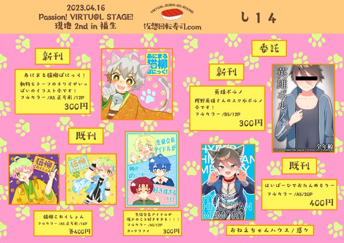 4/16 #パバステ現地2nd おしながきです🍣 し14【仮想回転寿司.com】 惑々さん(@grgrorrr)の委託もあります!卓上のものぜんぶフルカラー本‼️よろしくお願いします🎶 新刊サンプル▼ twitter.com/kinooooo_ko/st… #パバステ現地2nd告知_0416